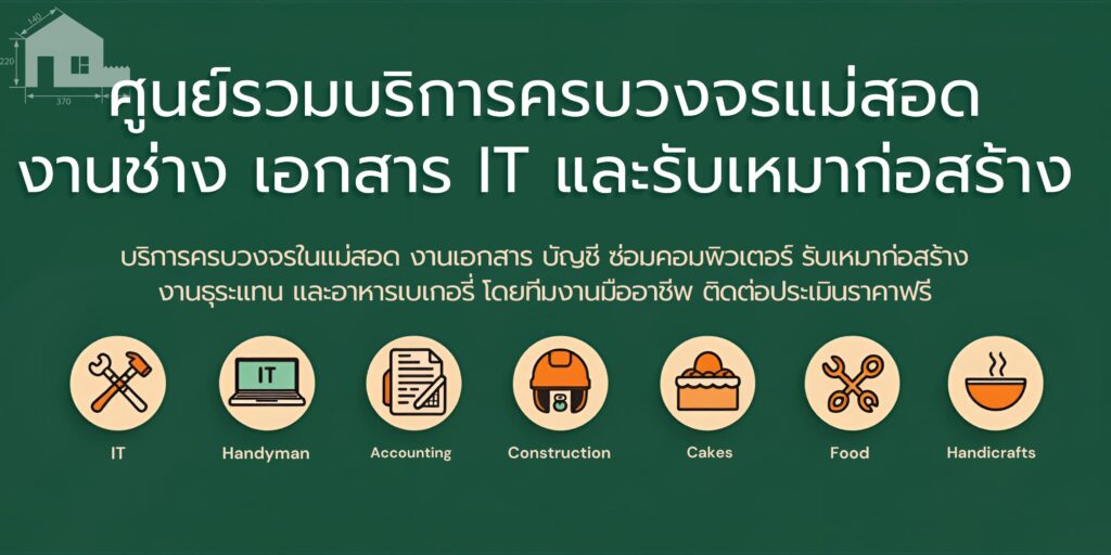 บริการของเราครอบคลุมงานหลากหลายประเภท เช่น รับเหมาก่อสร้าง งานช่าง งานเอกสารและบัญชี รับทำเว็บไซต์ งานคอมพิวเตอร์ รวมถึงบริการผู้ช่วยส่วนตัวในแม่สอด โดยสามารถนัดหมายล่วงหน้าเพื่อประเมินงานหรือให้คำปรึกษาได้