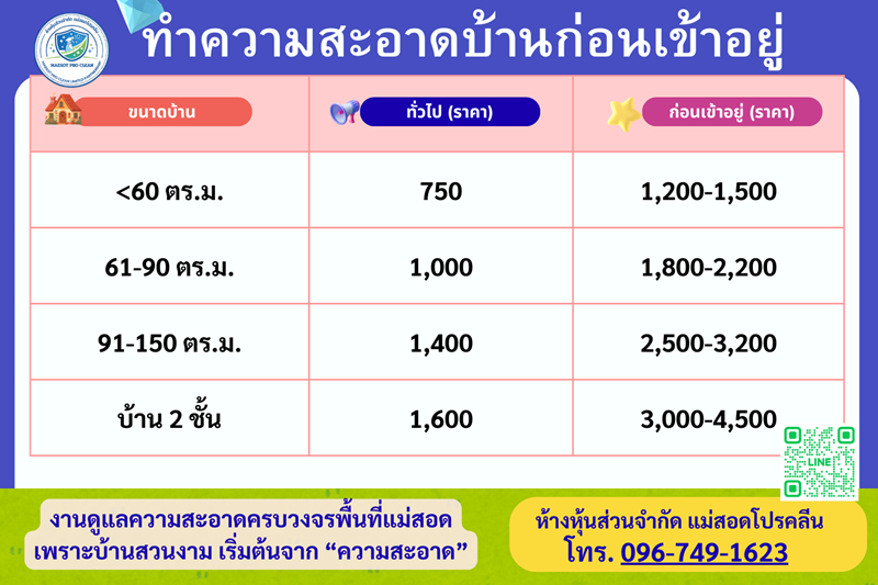 | ทำความสะอาดบ้านทั่วไป | เริ่มต้น 750-1,000 บาท |